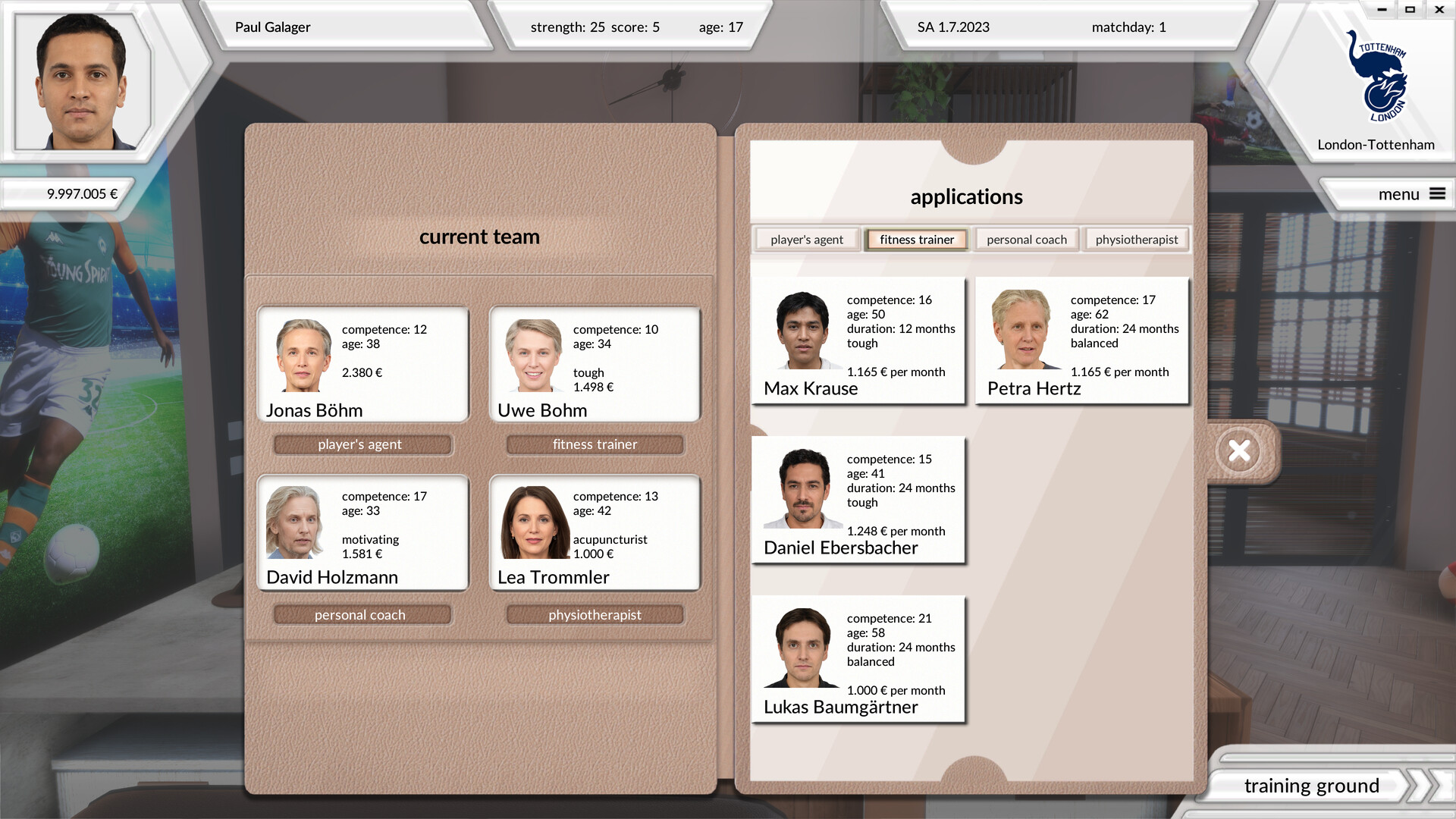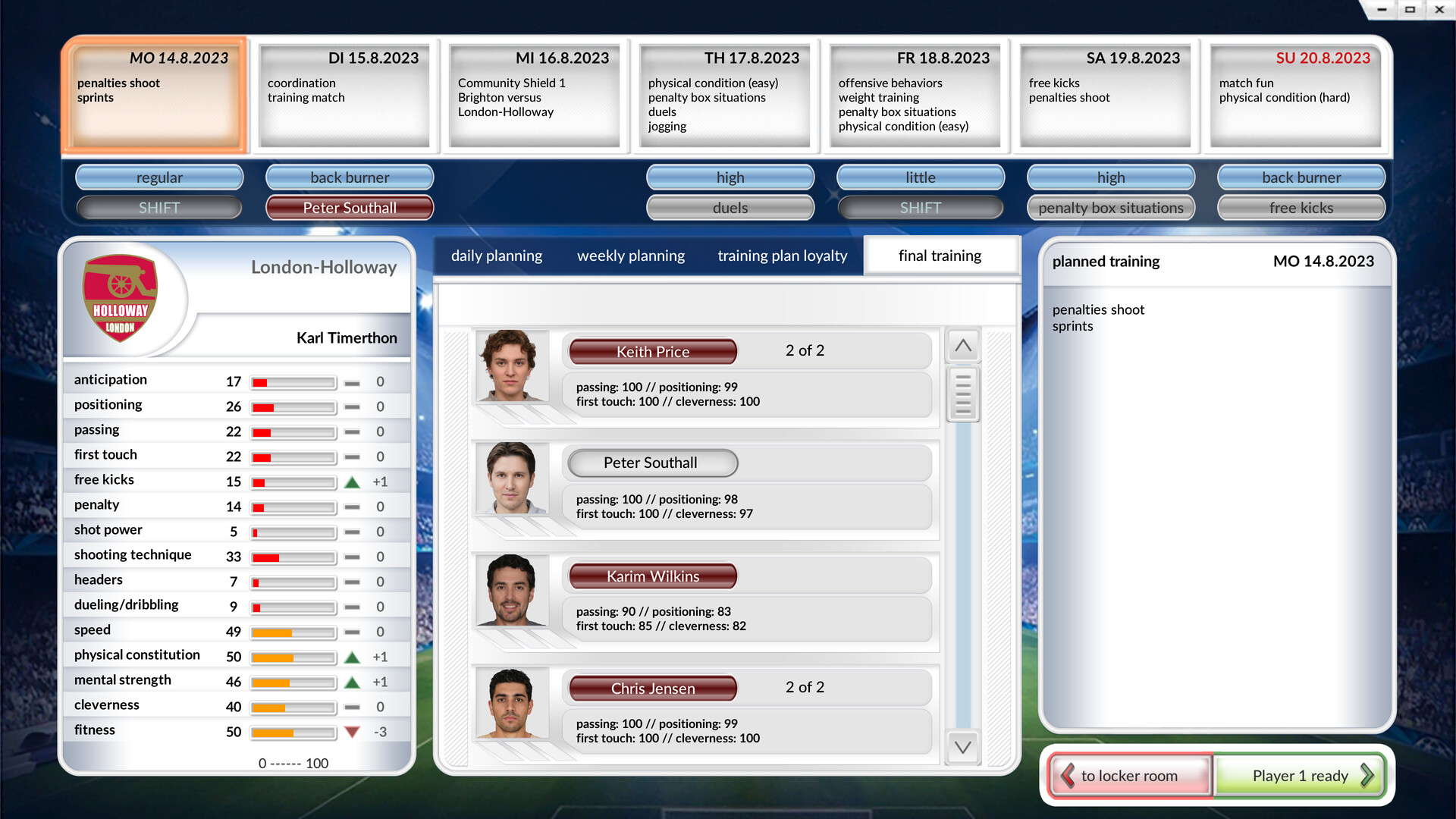 • Improve your 15 skills through training. Do you want to follow the coach's instructions or set your own priorities?