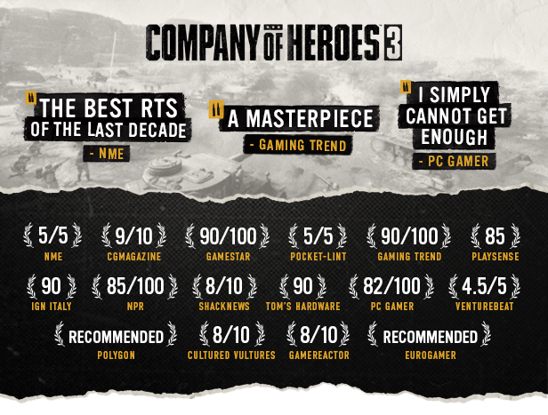 Company of Heroes 3 is out now! Bigger and better than ever, CoH3 is bringing its acclaimed mix of action, tactics, and strategy to millions of fans across the world. Immerse yourself in two epic campaigns, four unique multiplayer & co-op factions, and a breathtaking new theatre spanning from the sweeping deserts of North Africa to the rolling hills of Italy. Join the Fight with new features such as Full Tactical Pause and our Dynamic Campaign Map enable you to take complete control of the battlefield.