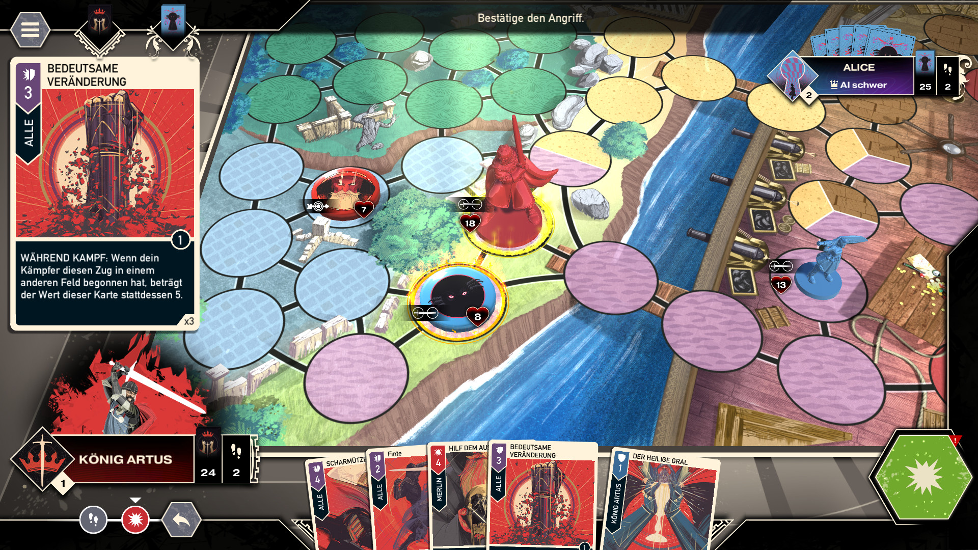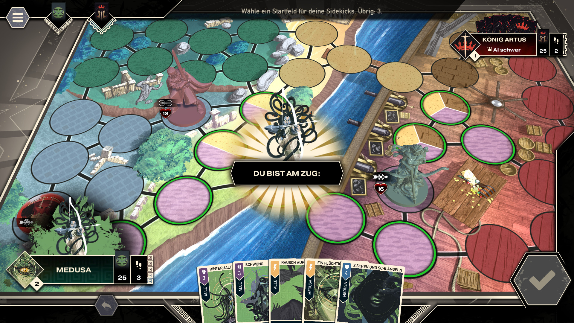 Was das Spiel so besonders macht, ist dass jeder Held ein einzigartiges Deck und eine einzigartige Fähigkeit hat. Alice wird groß und klein. König Artus kann eine Karte abwerfen, um seinen Angriff zu verstärken. Sindbad wird stärker, je mehr er reist. Medusa kann dir mit einem bloßen Blick Schaden zufügen.