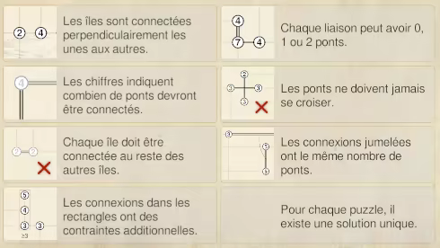 Il y a 5000 puzzles au total. Dans chaque niveau la moitié des puzzles sont des puzzles avec les règles classiques de Hashi-wo-kakero et l'autre moitié utilise les nouvelles règles de jumelage et de contrainte.