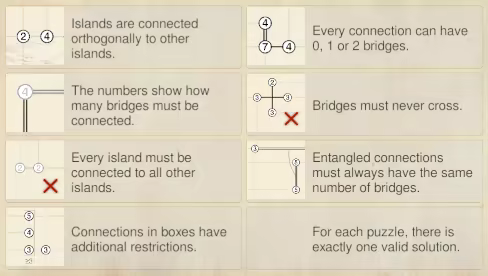 The game BridgeFix 2=3-1 is based on the Japanese Hashi-wo-kakero (橋をかけろ, aka "Hashi") logic puzzles. As with Sudoku, the rules of the puzzles are easy to understand but hard to master and create many interesting problems for the player to solve.