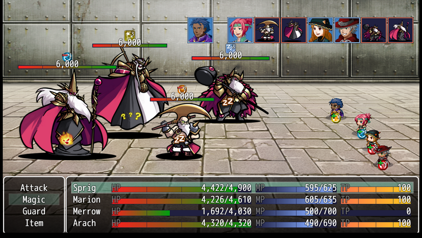 - A turn-based battle system involving elemental strengths and weaknesses, an assortment of buffs and debuffs and status ailments, and monsters that scale with your progress, to keep battles fresh, interesting, and challenging