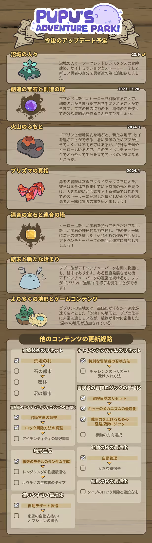 この土地を借りたププ族は、ゴブリンの力で“召喚”された“勇者”へ向けたアドベンチャーパークをオープンしました。ププの不思議なアドベンチャーパークでは勇者たちの思い出に残るような冒険を提供しています。そしてププ族は勇者たちの期待を満足させるために、パーク作りに日夜励んでいます!