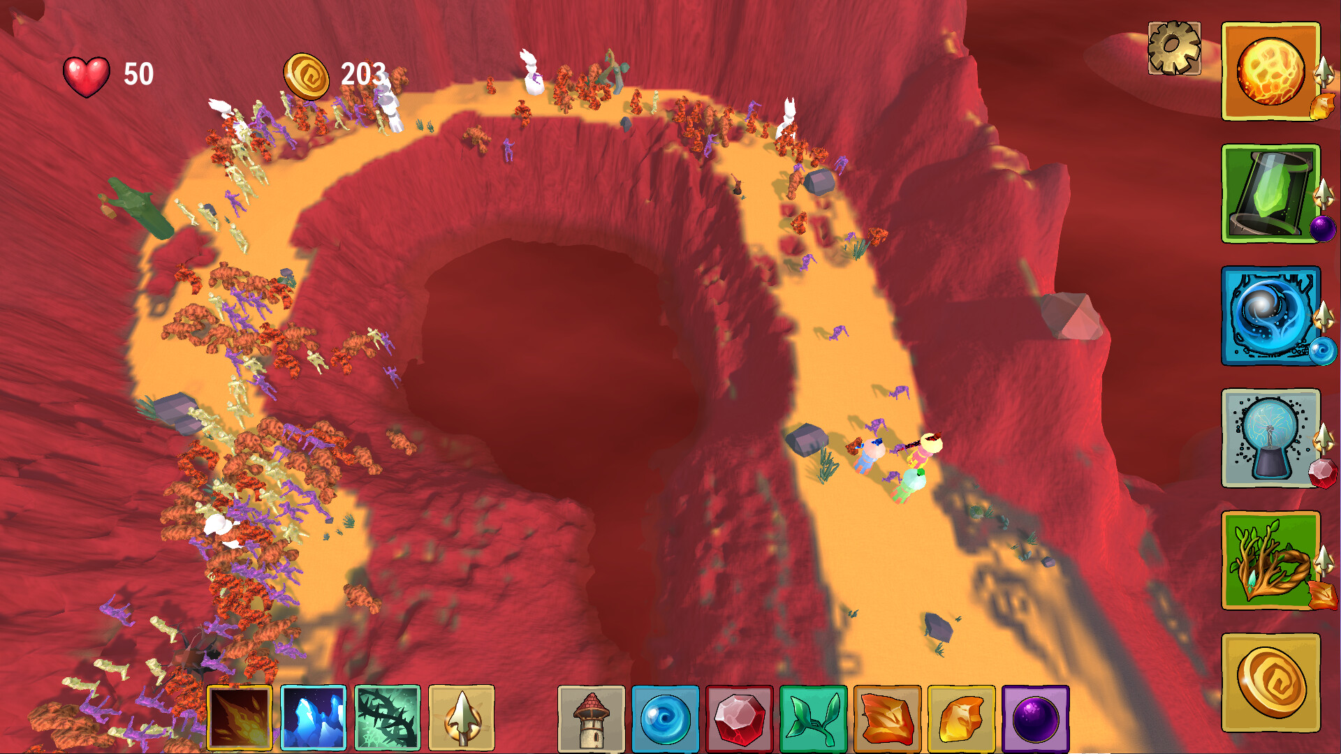 • Build an elaborate defense to restrain the hordes that assault you in each scenario.