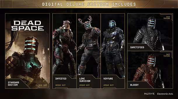 Dead Space Digital Deluxe Edition inneholder grunnspillet og fem eksklusive kosmetiske gjenstander (tre unike drakter og to draktteksturer). Det er alt du trenger for å ta deg bra ut mens du overlever grusomhetene om bord USG Ishimura.