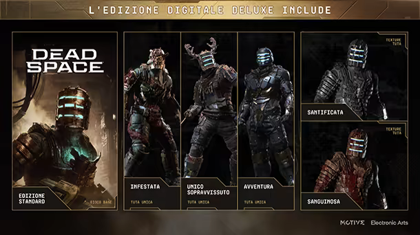 L'Edizione Digitale Deluxe di Dead Space include il gioco base e 5 oggetti estetici esclusivi (3 tute uniche e 2 texture delle tute): tutto ciò che ti serve per apparire al meglio mentre cerchi di sopravvivere agli orrori della USG Ishimura.