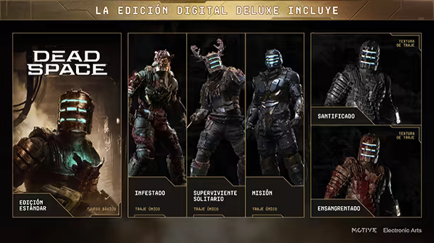 La Edición Digital Deluxe de Dead Space incluye el juego base y cinco objetos estéticos exclusivos (tres trajes únicos y dos texturas de traje). No necesitas nada más para lucir tus mejores galas mientras sobrevives a los horrores a bordo del USG Ishimura.