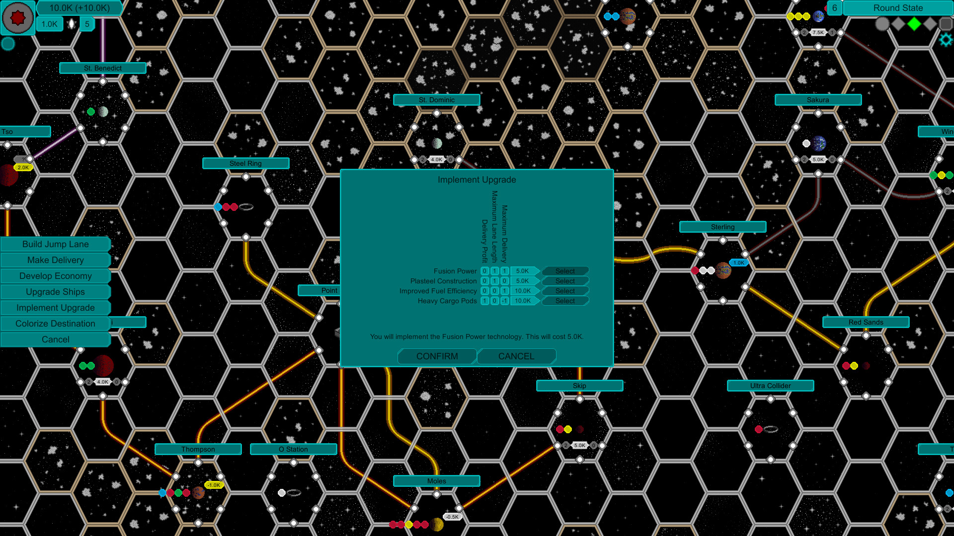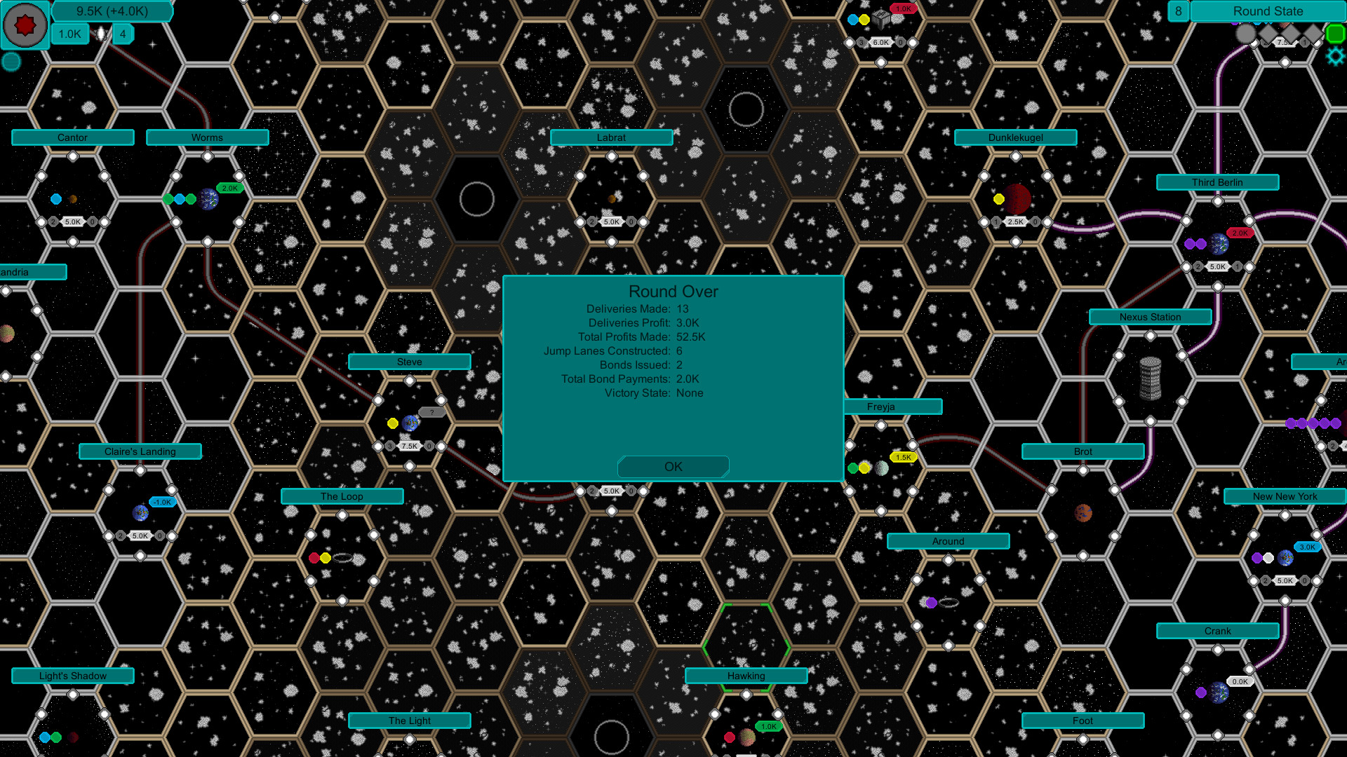 The steam train revolutionized transportation on Earth. It was only a matter of time before the same thing happened in space with different technology. Take control of a company building jump lanes through the timeline of their development. Will you build a successful company or fall behind your competition? Each turn you must decide between expanding your network, exploiting economic opportunities, or upgrading your hardware. Be careful which decisions you make; too much time upgrading may allow others to get the best opportunities first.