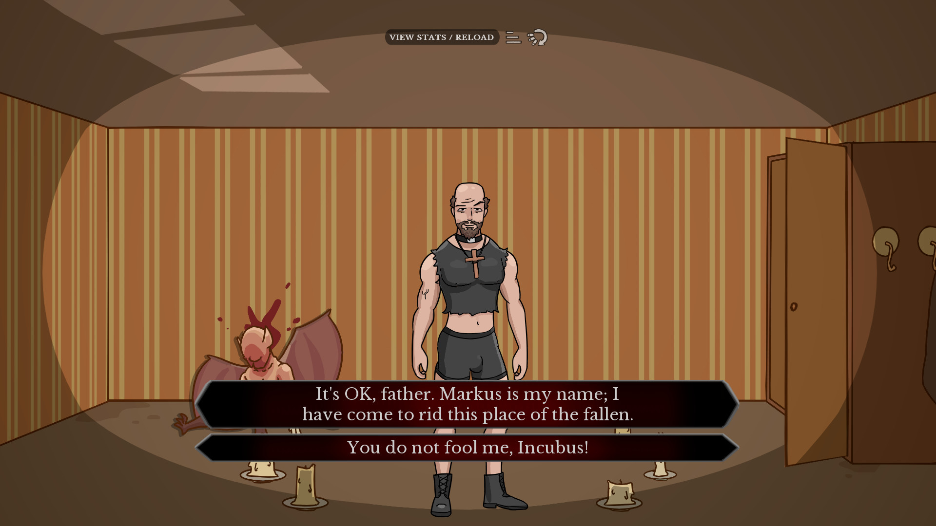 A point-and-click adventure with turn-based combat. Explore a demon-infested house and uncover a dangerous ritual. Encounter succubi, imps, priests and more on your quest to expose demons to the world. A short game with multiple endings.