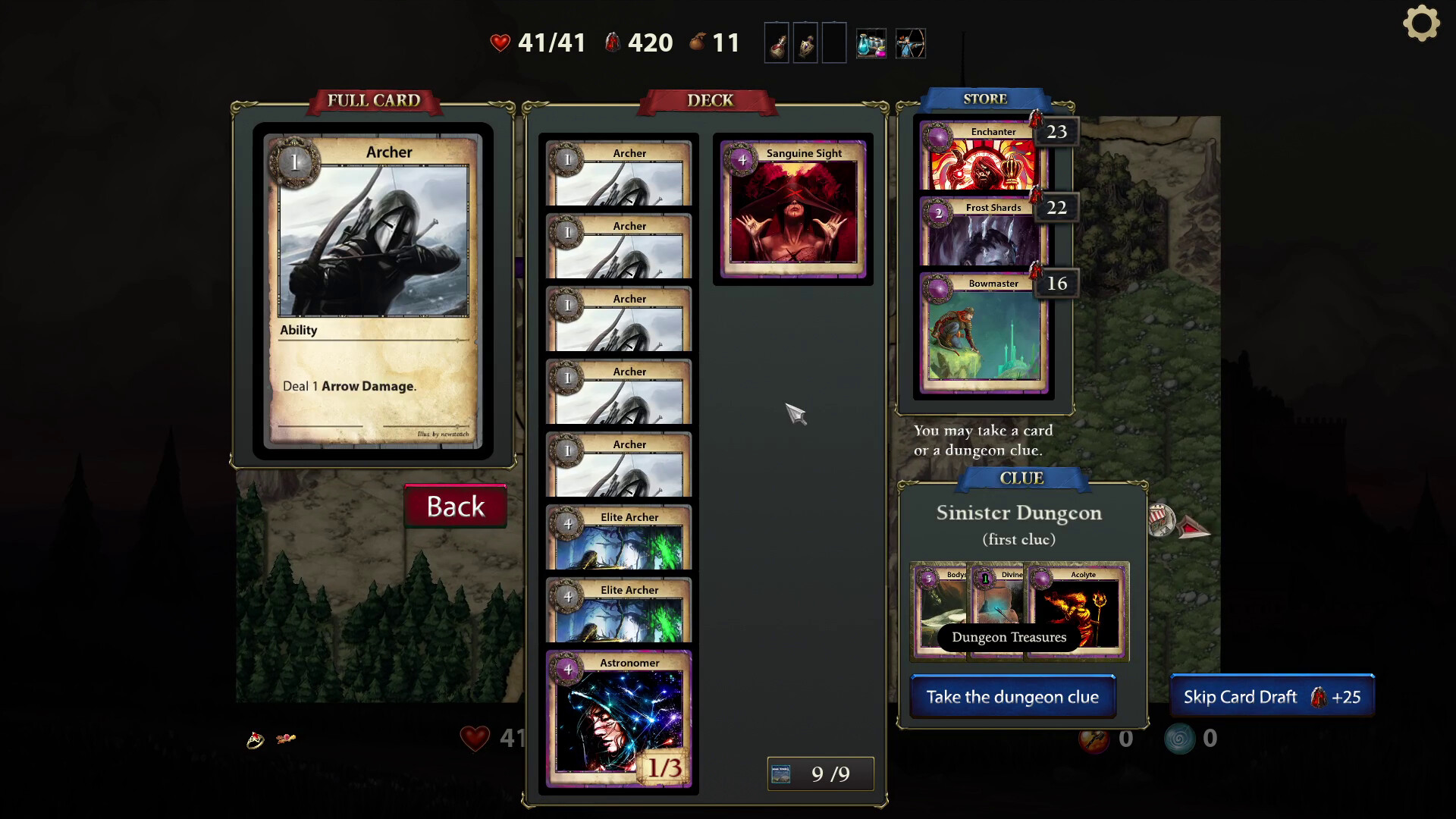 “The player can play runs where they travel an overworld, build a deck of cards, delve into dungeons, and fight bosses. They can progress on an Achievement board and unlock more cards and character classes, and can fight at higher difficulties each time they win.”