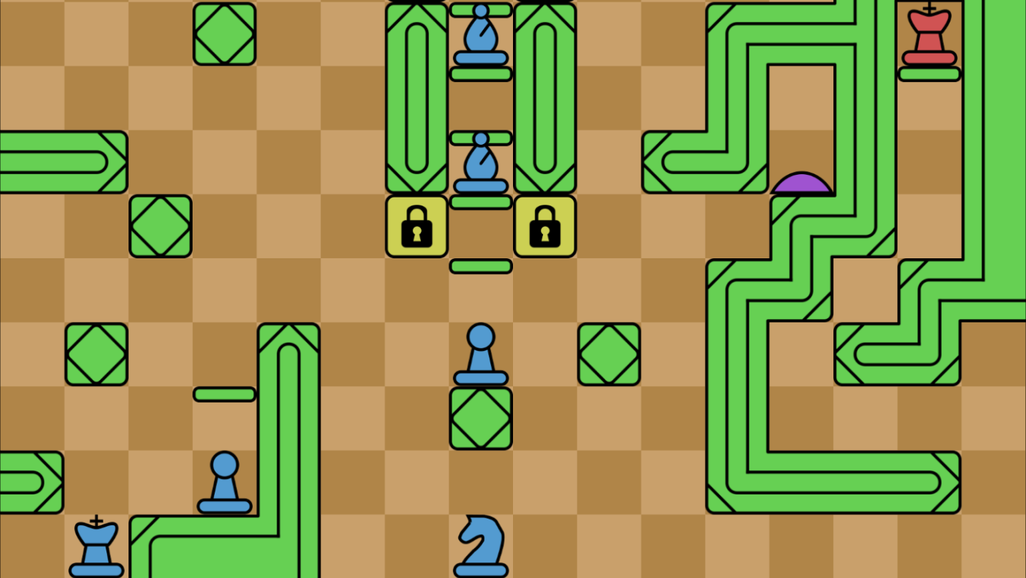 Chessformer is a grid-based puzzle platformer with Chess pieces. Each of the pieces moves as expected, but they fall down after moving and can't move again until they stop falling. Pieces also stack on top of each other which is key to solving most levels. The goal in each level is to capture the opposing king, who is lazy and never moves, so don't worry about losing any pieces.