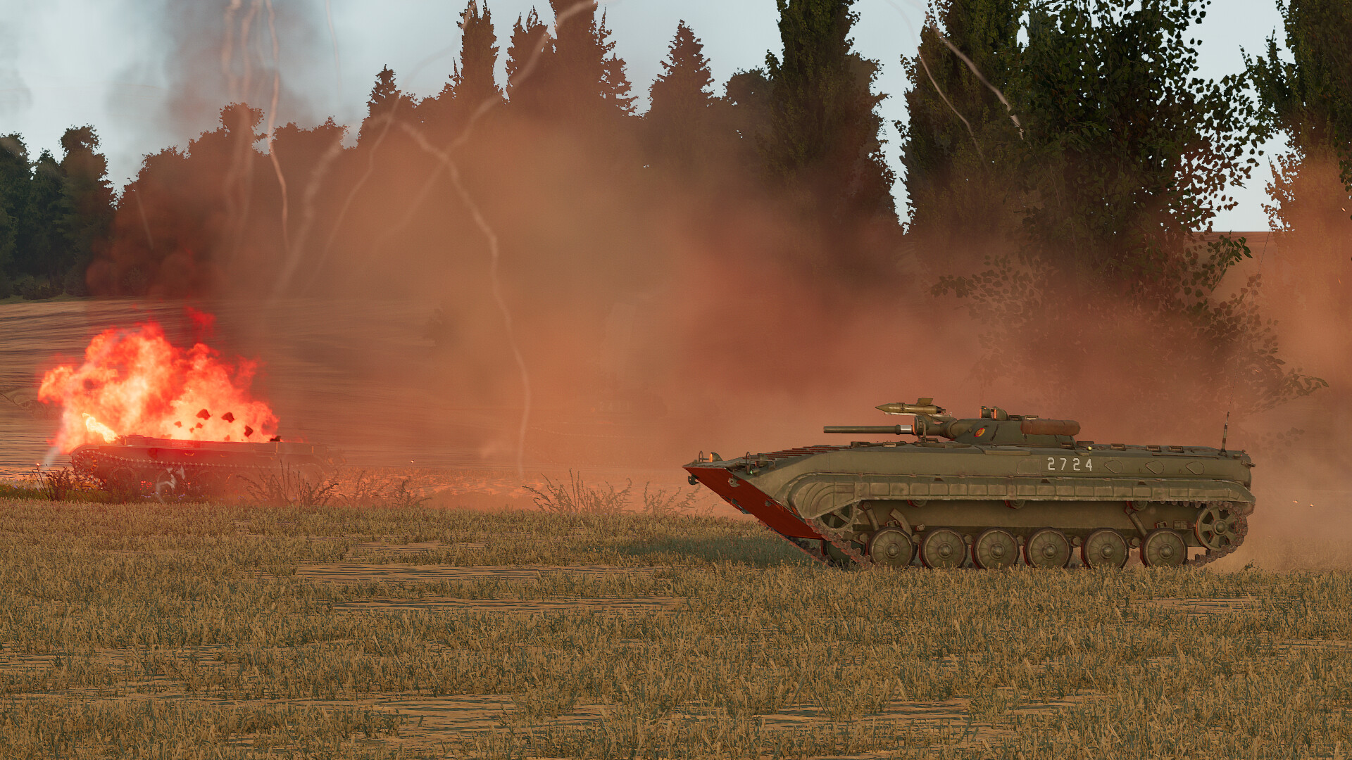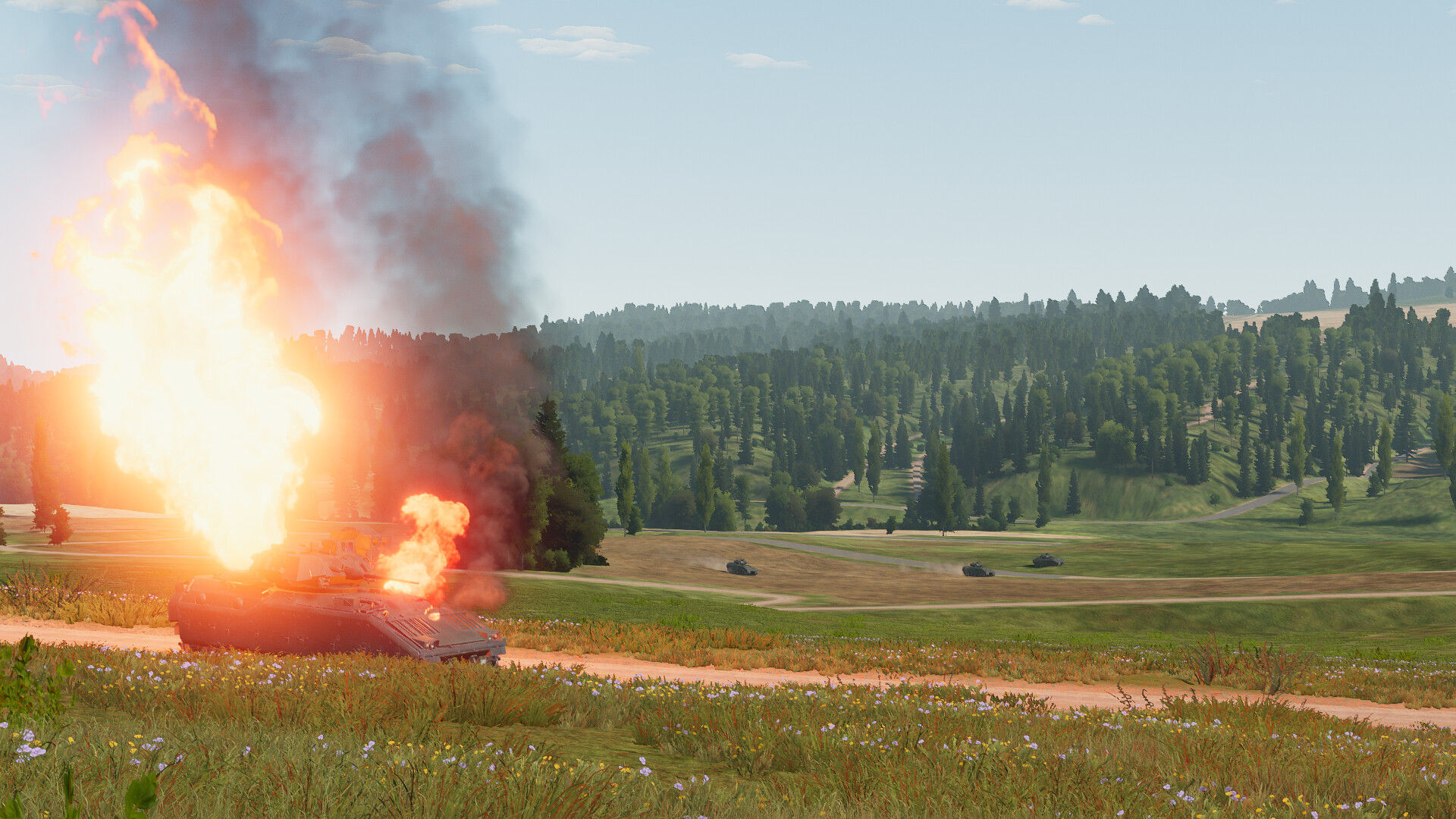 Combat is resolved via detailed simulation of fire control systems, ballistics, armor penetration, and post-pen effects. From the moment a target is spotted, the unique characteristics of each vehicle and munition determine the outcome. Players must use the available tools, such as day and night sights, rangefinders, and lead compensation, to line up the perfect shot. Once the round leaves the muzzle, its fate is determined by a robust projectile flight model and a research-based armor penetration model. A successful hit produces spalling, fragmentation, and blast overpressure in the target, wreaking destruction on individual crew members and vehicle systems. A vehicle is only knocked out when injury, destruction, or conflagration force it to become combat-ineffective.