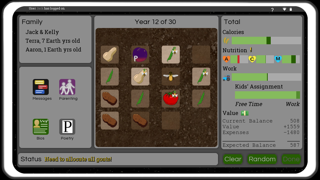 • Customizable farm where you balance crops for calories, nutrition, and value.