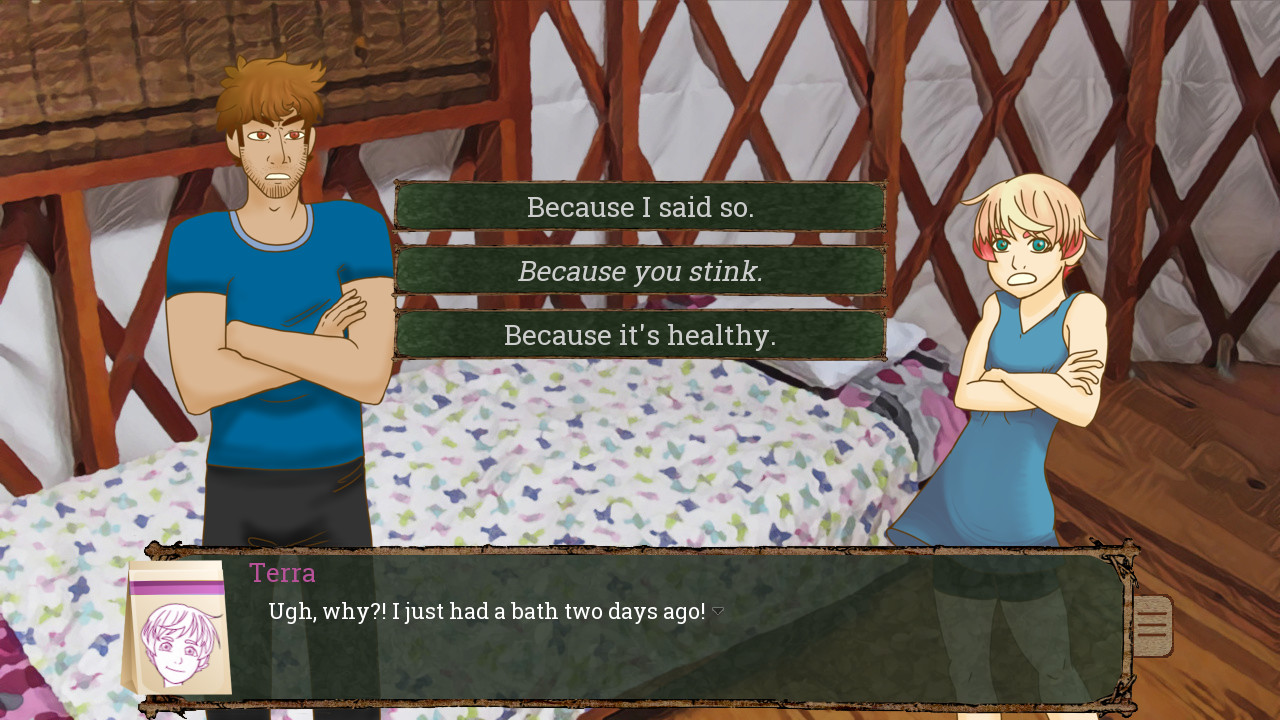 A visual novel where you play as a farmer, father, and community member. Decide what to plant, which faction to support, and what kind of dad you want to be. How will you react when your daughter won't stop crying? When she bullies her friend? Or when she wants to hang out with the cool kids?