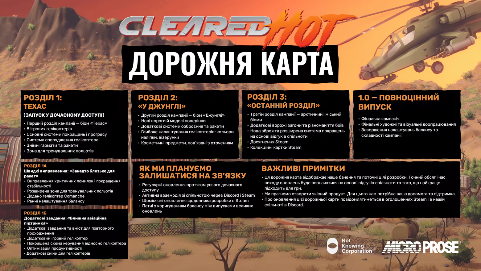 CLEARED HOT — ностальгічний вертолітний шутер із реалістичною фізикою та простими елементами тактики. Стріляй, ухиляйся, переміщуй свій загін по полю бою та підбирай майже все за допомогою тросу й магніту.