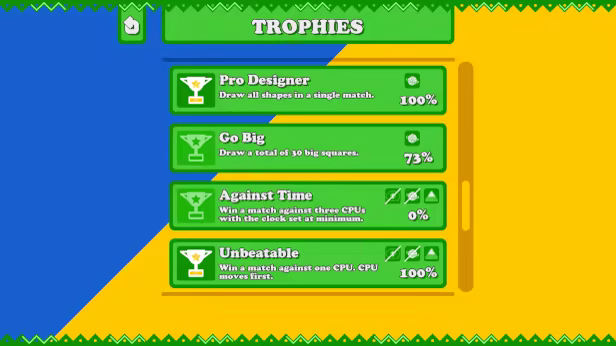TOCOViX comes with hard challenges which range from winning all levels against the CPU to conquering a certain number of boxes in a single match. Complete a challenge to obtain a Trophy and obtain all Trophies to unlock a special Cross!