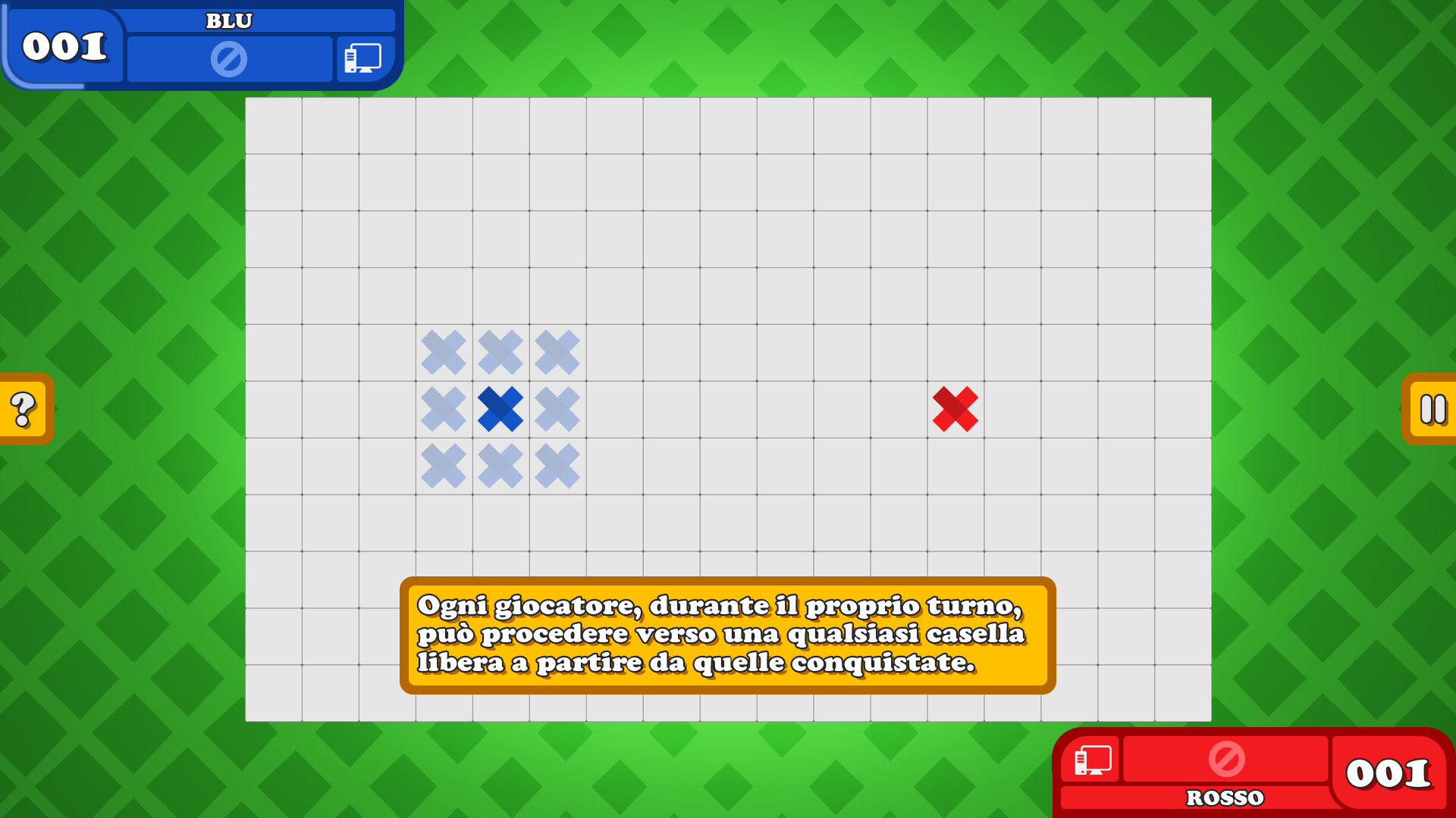 Un giocatore è eliminato quando non è più in grado di avanzare ovvero quando tutte le caselle sul campo confinanti le proprie X sono già occupate. La partita termina quando tutti i giocatori sono eliminati o quando l'ultimo rimasto ha più punti degli altri.