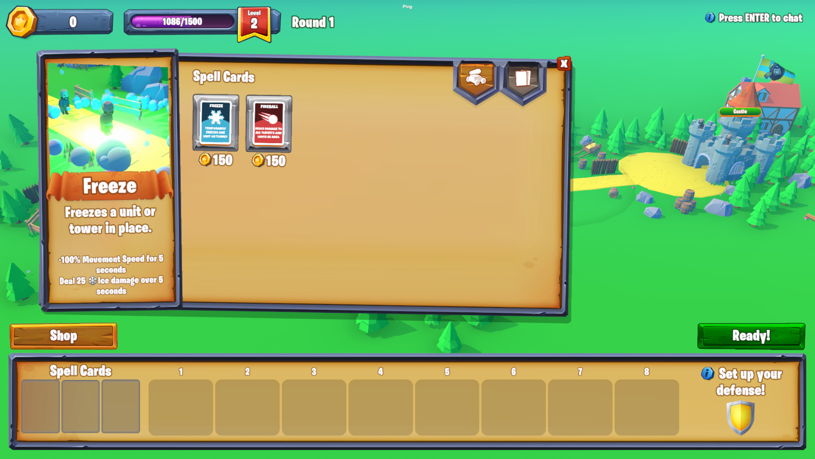 An asymmetric 1v1 tower defense/offense multiplayer game set in a fantasy medieval setting. Attack or defend the castle. Level up, and use magical spell cards to gain an advantage.