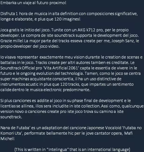 The Official Soundtrack for ‘Artificial Life 2061’ captures the essence of living in the future and the ongoing evolution of technology. However, as the game centers on machines acquiring consciousness, there is a distinctive use of acoustic instruments in most tracks, which impart a warm feeling within the predominantly electronic music.