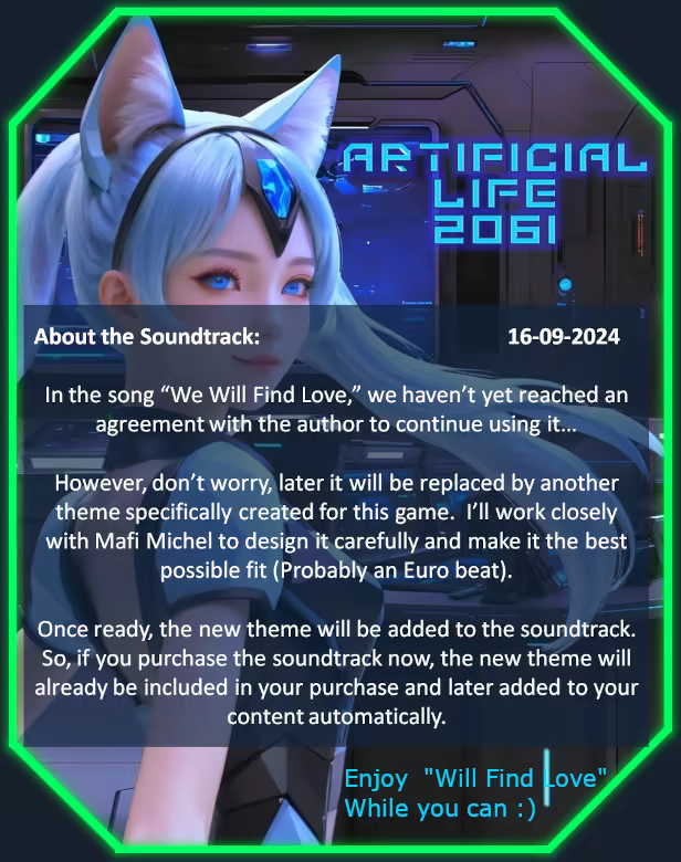 The Official Soundtrack for ‘Artificial Life 2061’ captures the essence of living in the future and the ongoing evolution of technology. However, as the game centers on machines acquiring consciousness, there is a distinctive use of acoustic instruments in most tracks, which impart a warm feeling within the predominantly electronic music.