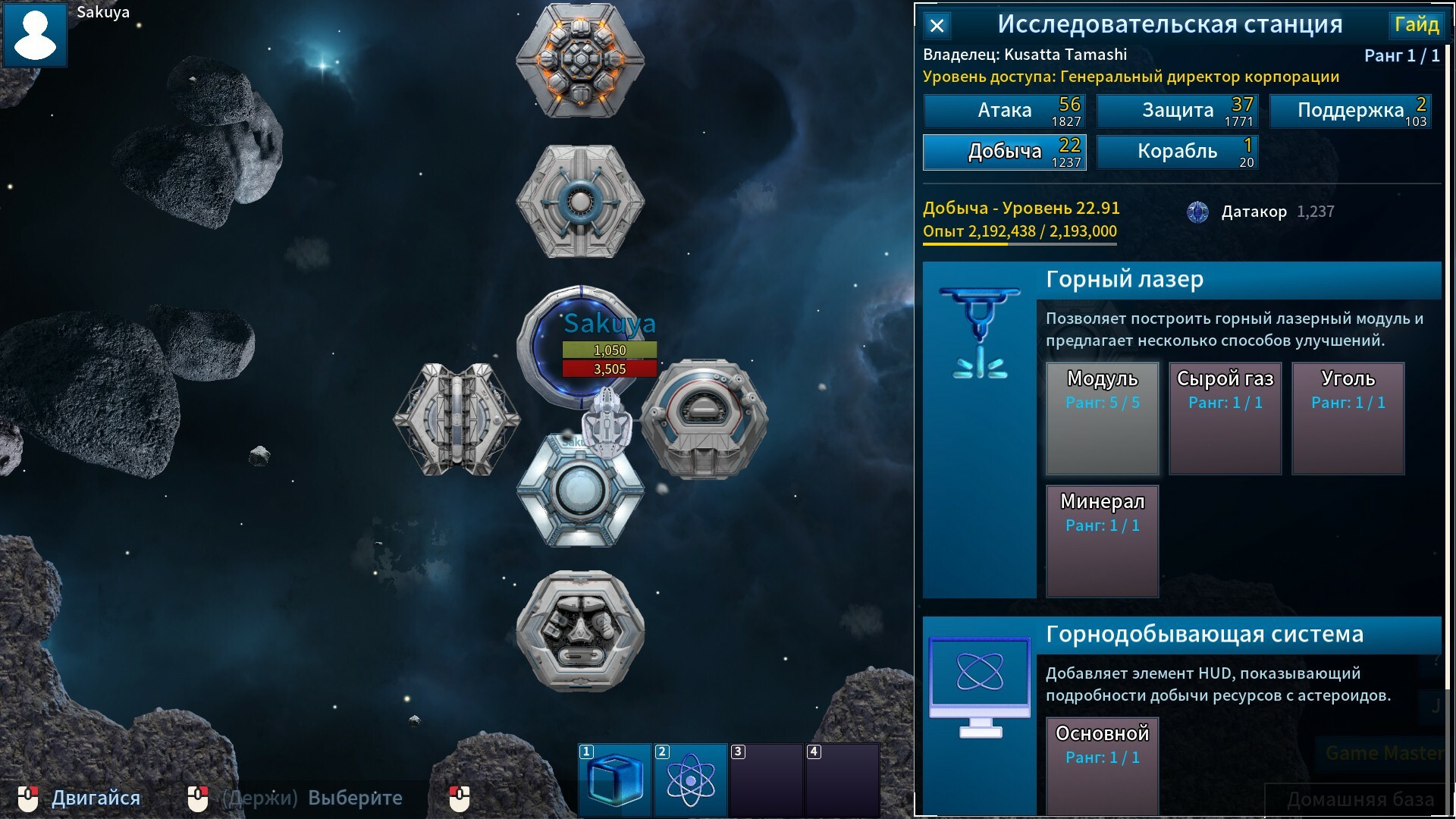 Добывай ценные ресурсы из астероидов, чтобы строить корабли и оборудование, исследовать новые технологии или возводить базу.