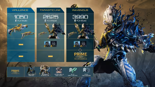 Make the newest Prime Customizations yours instantly. The Prime Accessories Pack includes Crinoid Prime Syandana, Karnolyth Necramech Skin, Infested Orbiter Decorations, 90-Day Affinity and Resource Boosters.