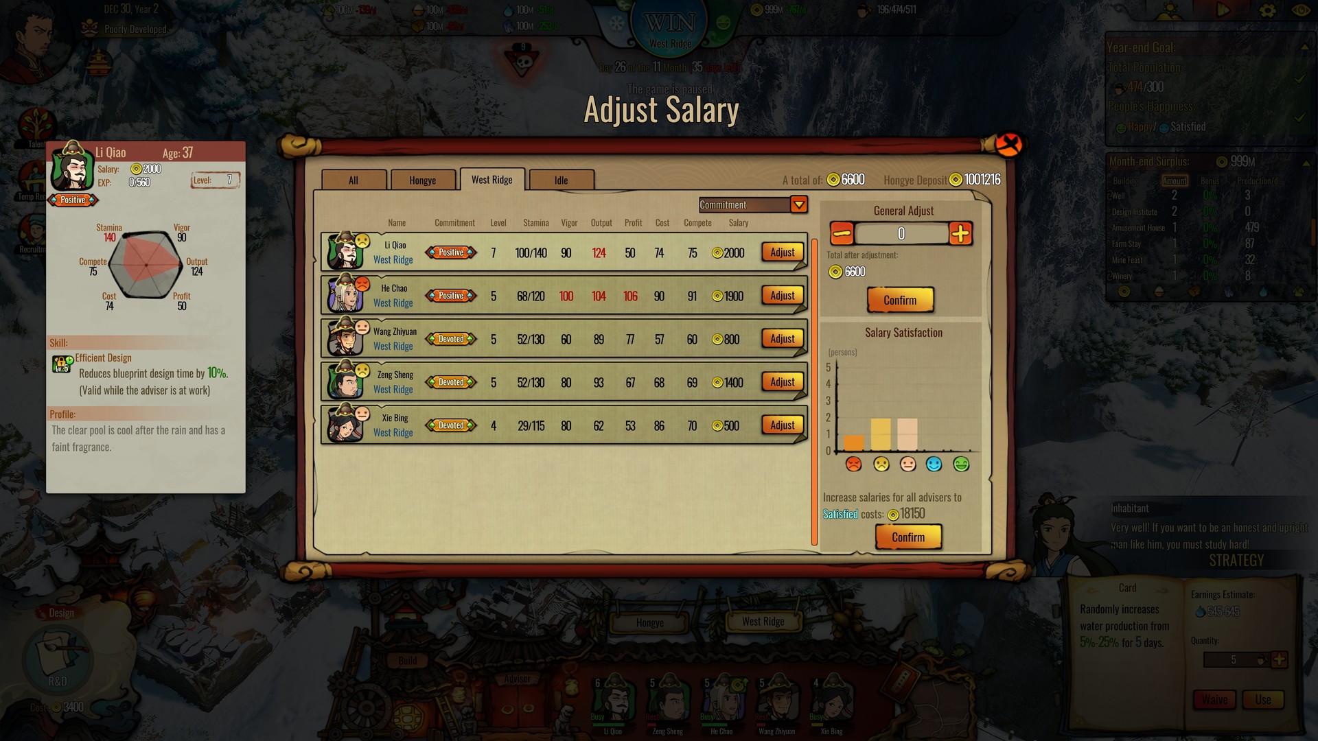 Only constants in Hongye are you and the land itself. Production yields are different for each season, so when choosing a building plan which determines your agricultural and industrial outputs during the challenges, you should plan ahead. Hone your advisers to provide additional plans for you and, if you can successfully face the challenge, you get to keep some of your blueprints to use them at other sites in Hongye.