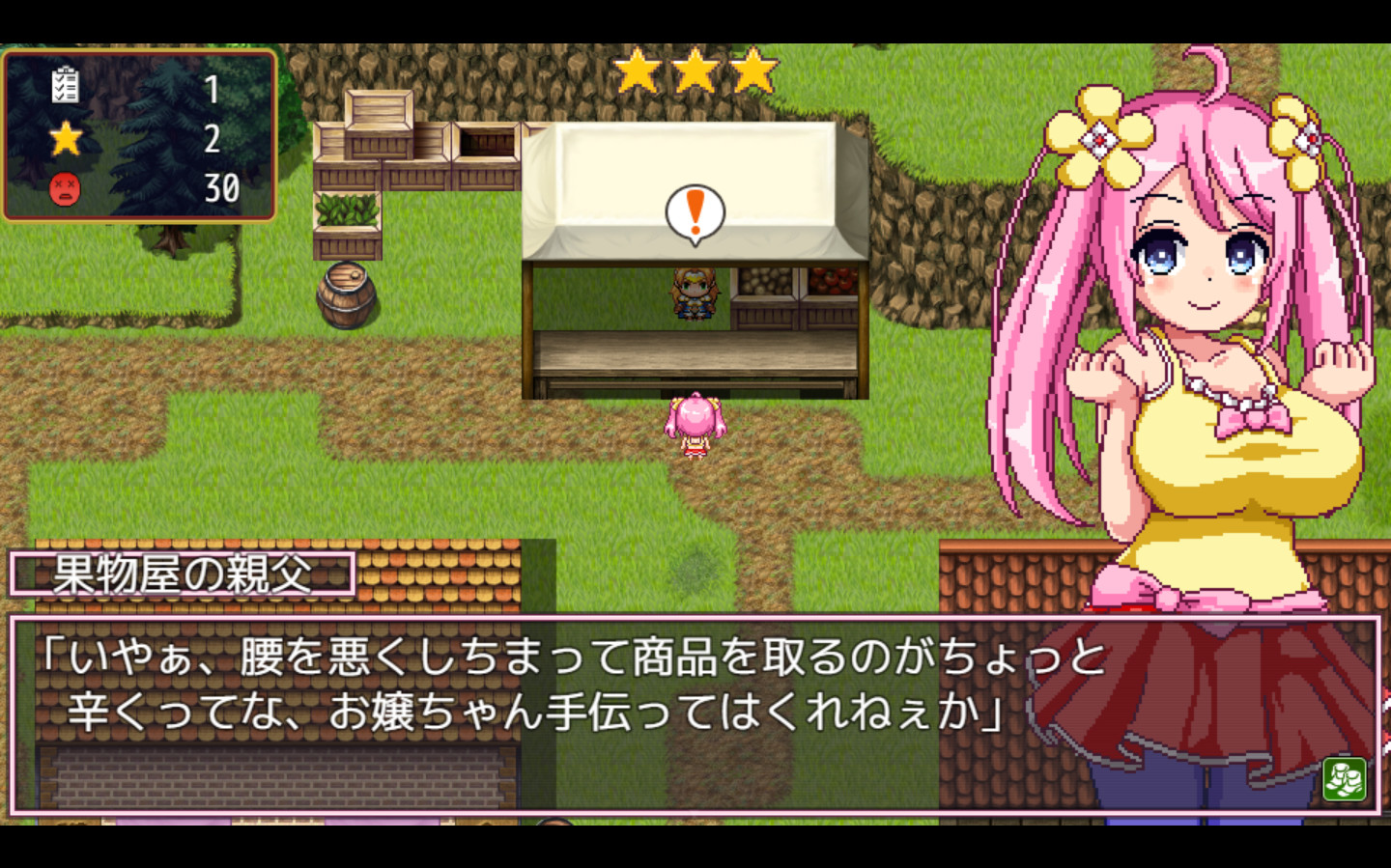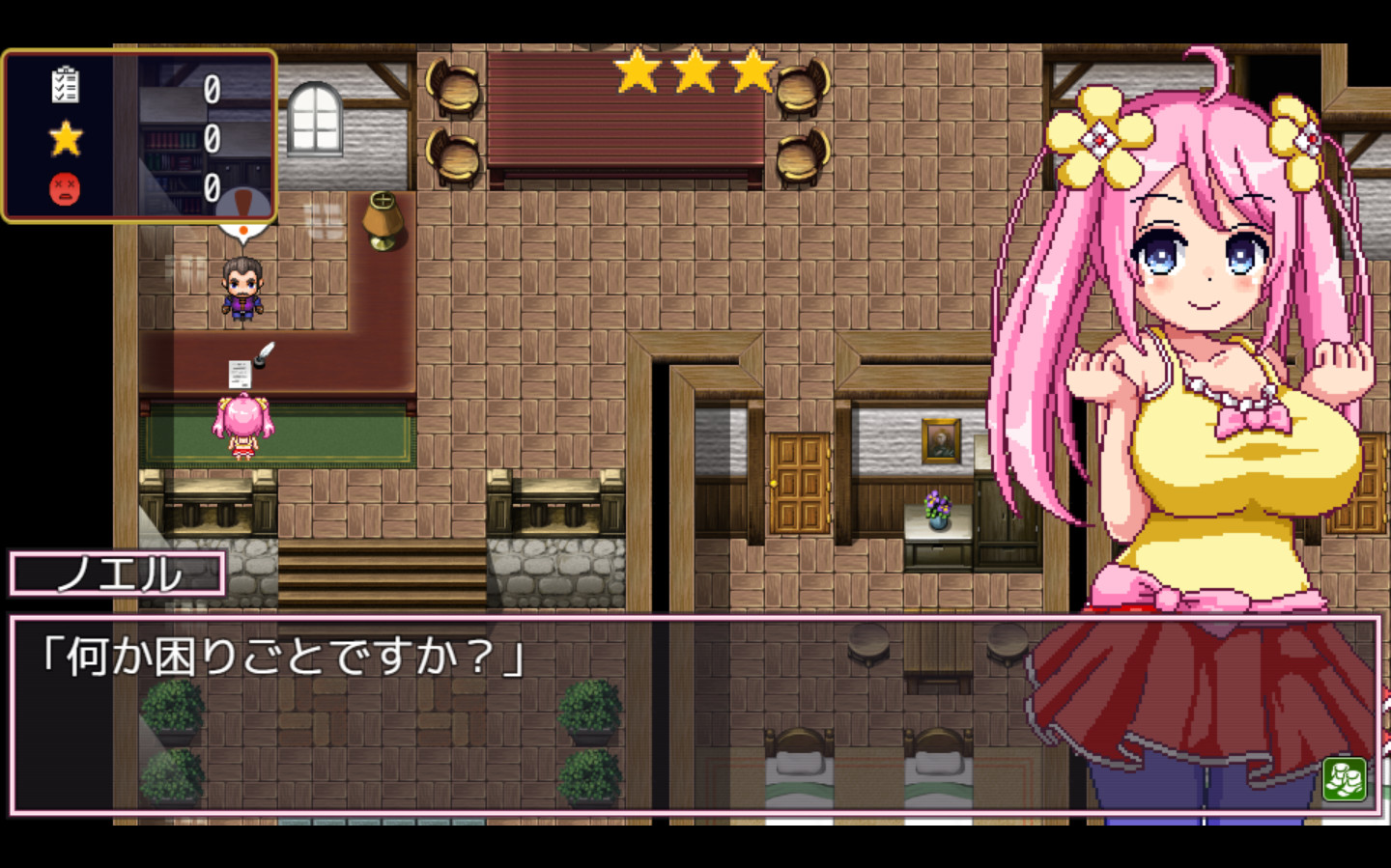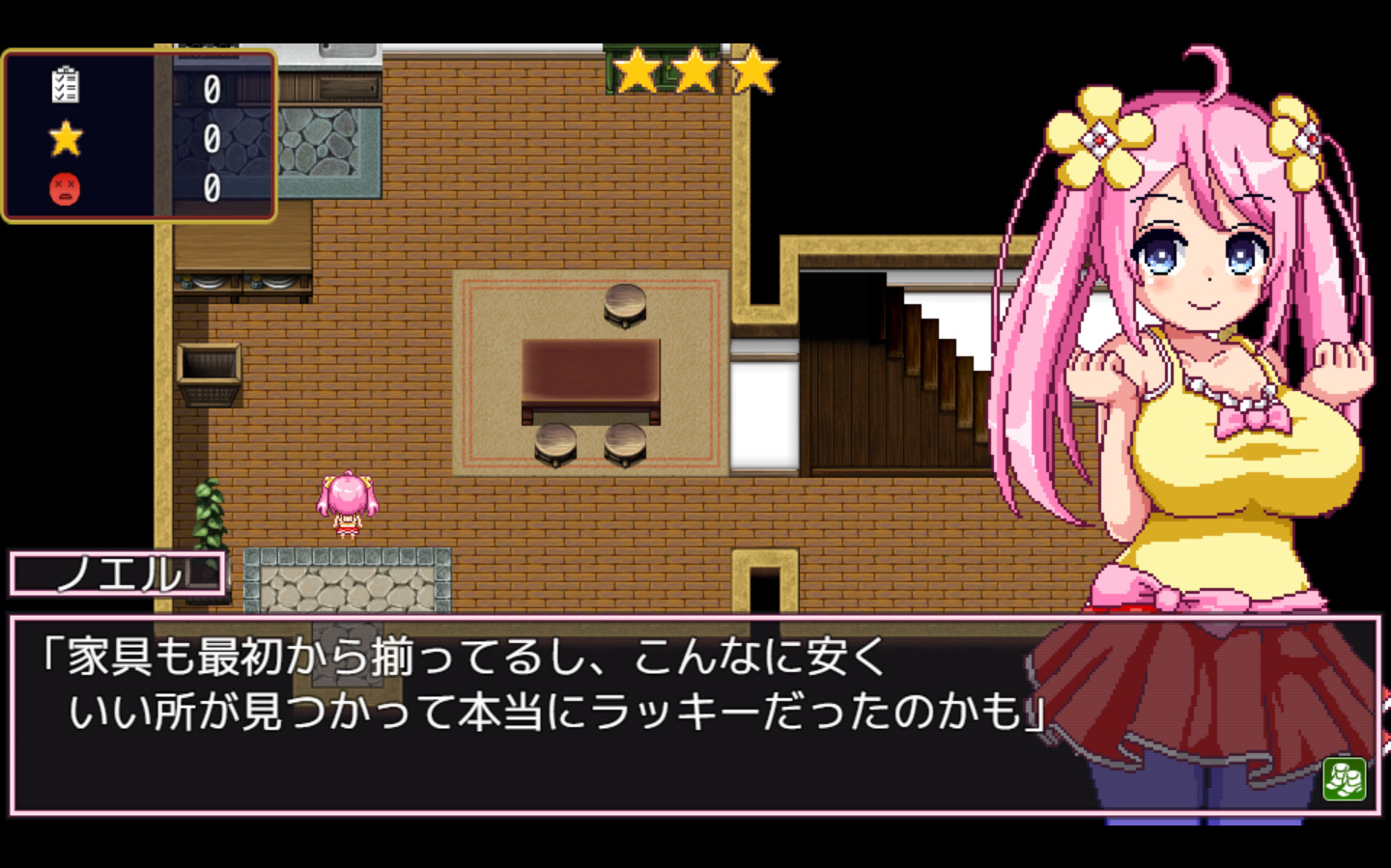 ミルムの町と周辺を探索し、できる限り多くの雑用を請け負いながら、借金を返済していこう!疲労度には注意してね。疲労度が100になると、ノエルは過労のために就寝することになるよ。