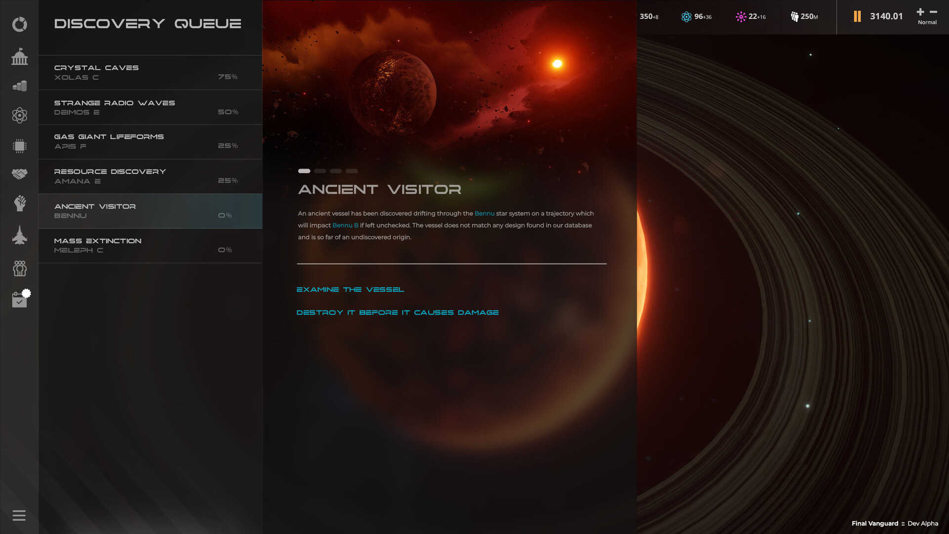 Final Vanguard is a real-time with pause grand strategy game in the 4x genre. You play in the role of an emperor, guiding your civilization and its people forward. The decisions you make and the interactions you have with other races within the cosmos will determine if your civilization thrives or perishes.
