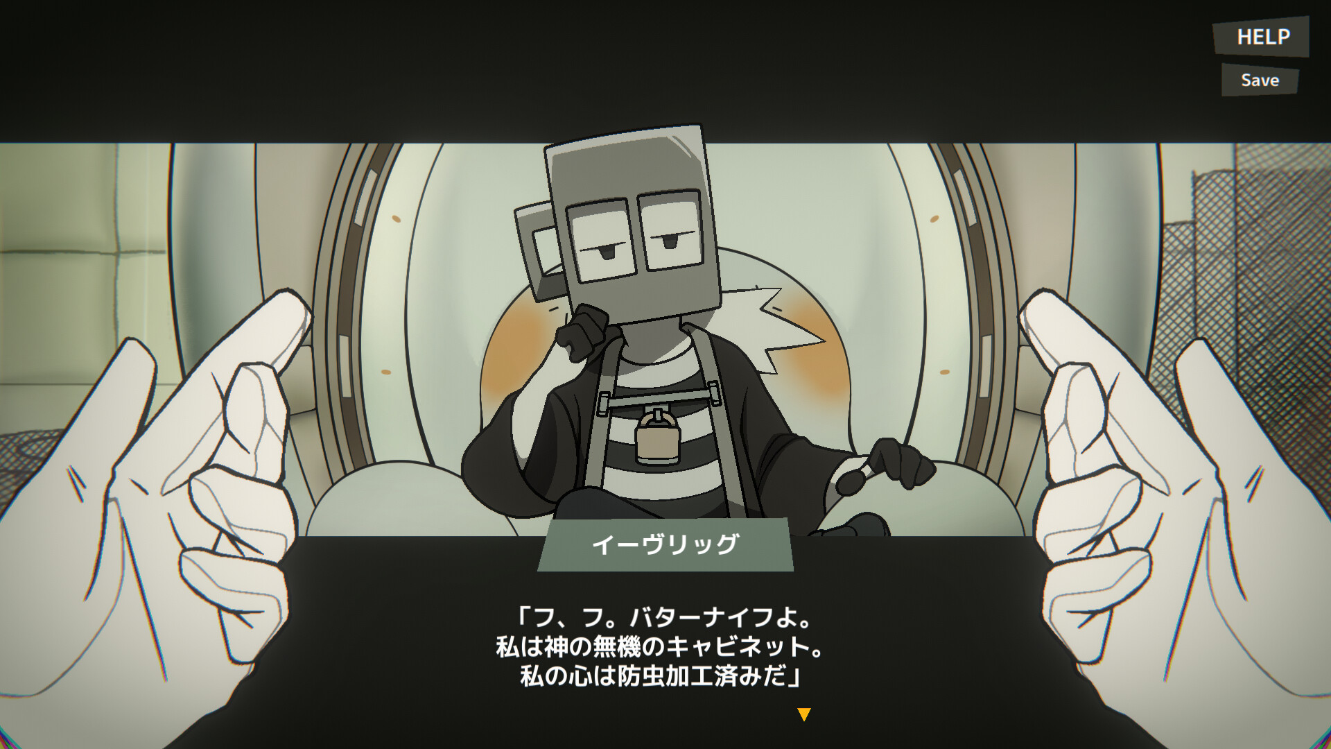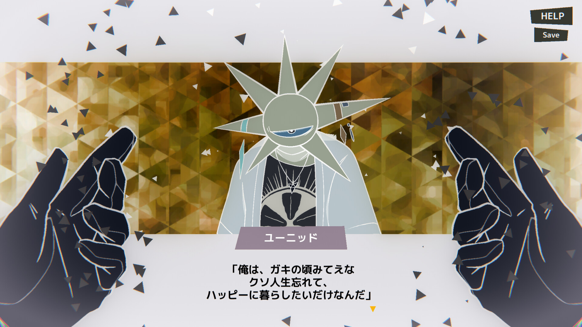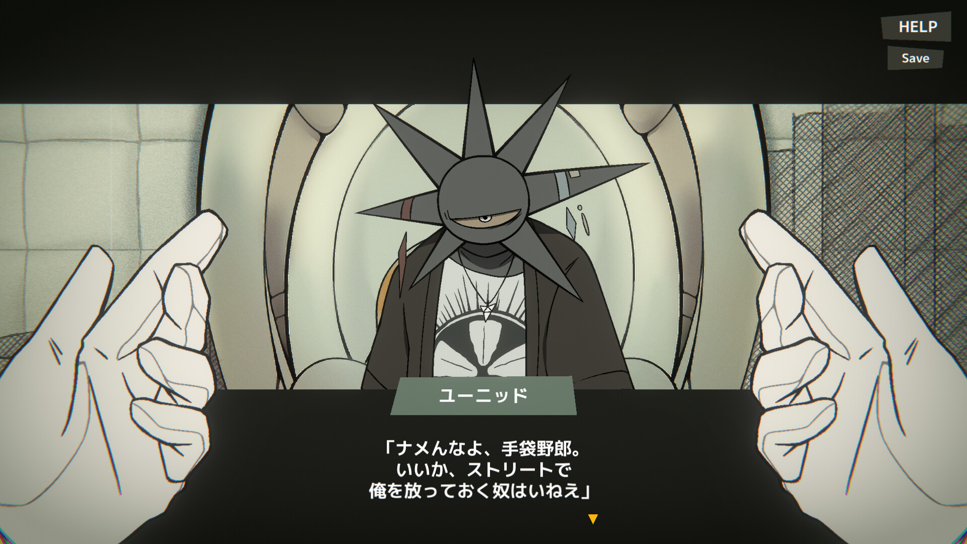 アドベンチャーパートでは、ディストピア世界に暮らすさまざまな悪人たちと対峙します。登場するキャラクターは個性豊かな曲者揃い。ゲーム画面には常に主人公自身の「手」が映り込み、鮮やかなアニメーションで彼らとの対話を彩ります。