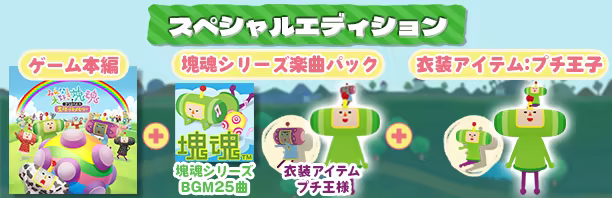 「スペシャルエディション」は、「みんな大好き塊魂アンコール+王様プチメモリー」ゲーム本編と衣装アイテム:プチ王子、塊魂シリーズ楽曲パックがセットになった製品です。
