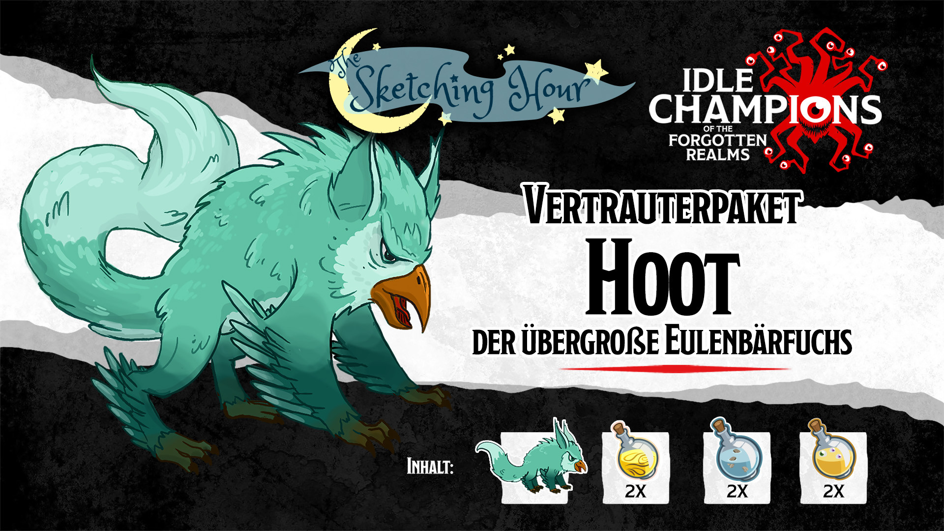 Hoot der übergroße Eulenbärfuchs wurde von unseren eigenen Designern im Rahmen unserer Livestream-Show „The Sketching Hour“ entworfen. Jede Woche erschaffen zwei unserer Designer ein einzigartiges Wesen, indem sie ein existierendes D&D-Monster, ein Adjektiv und ein süßes Tier miteinander kombinieren. In einer Sonderfolge stimmten die Zuschauer von The Sketching Hour dafür, dass Hoot ins Spiel aufgenommen werden sollte. Nun hoffen wir, dass ihr diese originelle Kreation in die Reihen eurer Vertrauten aufnehmen werdet. Wenn ihr The Sketching Hour noch nicht kennt, seht euch die vergangenen Folgen auf YouTube an!