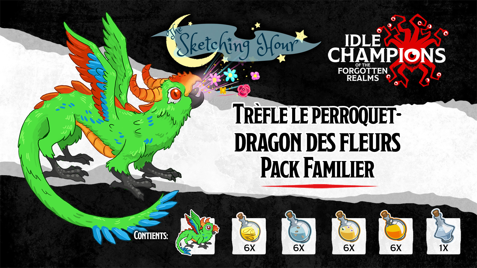 Trèfle le perroquet-dragon des fleurs a été créé par nos graphistes internes dans le cadre de notre émission diffusée en streaming : The Sketching Hour. Chaque semaine, deux de nos graphistes créent une créature unique, savanr mélange d'un monstre D&D existant, d'un adjectif et d'un animal adorable. Lors d'un épisode spécial, les spectateurs de ""The Sketching Hour"" ont voté pour que Trèfle rejoigne le jeu ! Nous espérons que vous l'ajout de cette création originale à votre liste de familiers vous mettra du baume au cœur. Si vous ne connaissez pas encore Sketching Hour, jetez un coup d'œil à nos anciens épisodes sur YouTube !