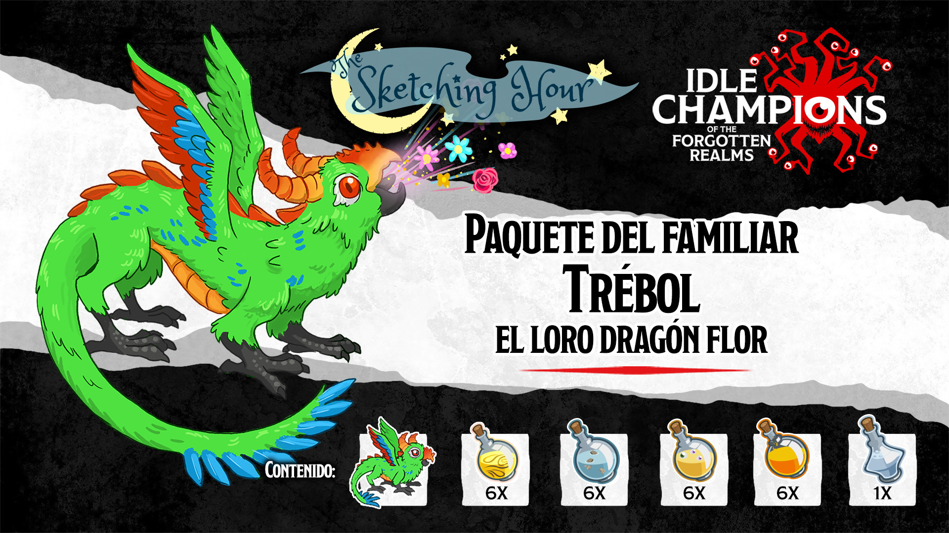 Trébol, el loro dragón flor, fue creado por nuestros artistas internos, como parte de nuestro programa que se transmite en vivo: «The Sketching Hour». Cada semana, dos de nuestros artistas crean una criatura única combinando monstruos existentes de D&D, un adjetivo y un animalito tierno. Durante un episodio especial, los espectadores de «The Sketching Hour» votaron para que Trébol se sumara al juego. Esperamos que disfrutes de esta creación original en tu lista de familiares. Si no conocías Sketching Hour, échale un vistazo a los episodios anteriores en YouTube.