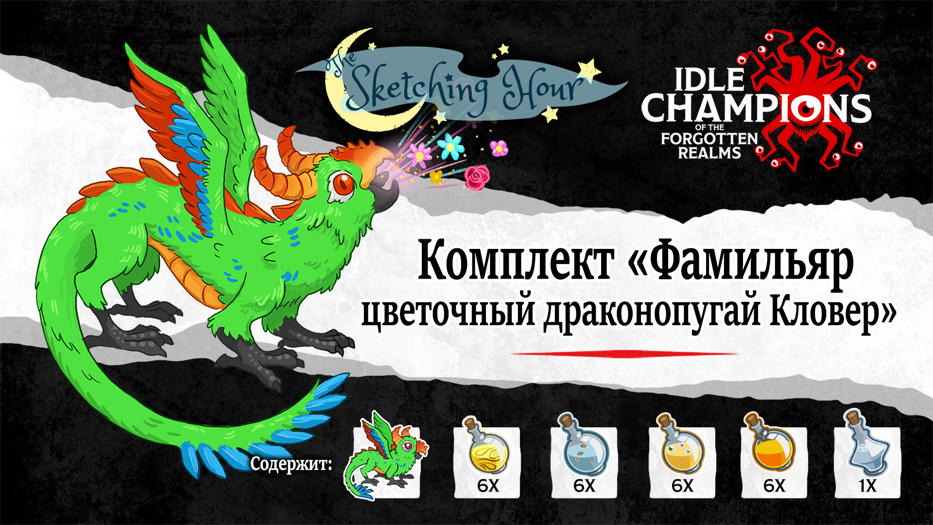 Цветочный драконопугай Кловер был создан нашими художниками в рамках транслировавшегося в прямом эфире шоу под названием The Sketching Hour. Каждую неделю два наших художника создают уникальное существо путем «смешивания» существующего монстра из мира D&D, некоего прилагательного и какого-нибудь милого животного. Во время специального выпуска The Sketching Hour зрители проголосовали за то, чтобы Кловер стал частью нашей игры! Надеемся, что вам тоже захочется добавить это оригинальное творение в свою коллекцию фамильяров. Если вы раньше не слышали о The Sketching Hour, вы можете посмотреть предыдущие выпуски этого шоу на Youtube!