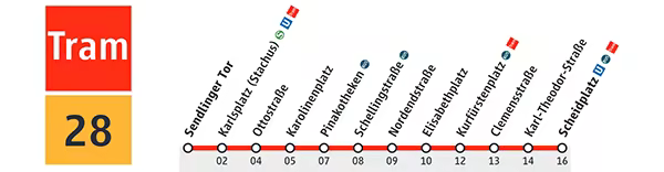 The route 28 starts from the Sendlinger Tor as well and runs over Karlsplatz and Karolinenplatz to the Kurfürstenplatz. There it splits from the shared route with route 27 and travels to the Scheidplatz.