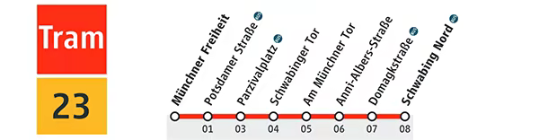 The route 23 runs from the Münchner Freiheit, over the Schwabinger Tor, and finally to Schwabing Nord. It is a special route in the city, as it starts in a specially built station-building at the Münchner Freiheit and operates on an independent track body and its own bridge structure.