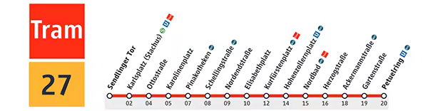 The route 27 runs in the heart of Munich, starting from the Sendlinger Tor over Karlsplatz, Karolinenplatz, Kurfürstenplatz, and Hohenzollernplatz, to the Petuelring. This route is not just operating by day, it is also used by night.