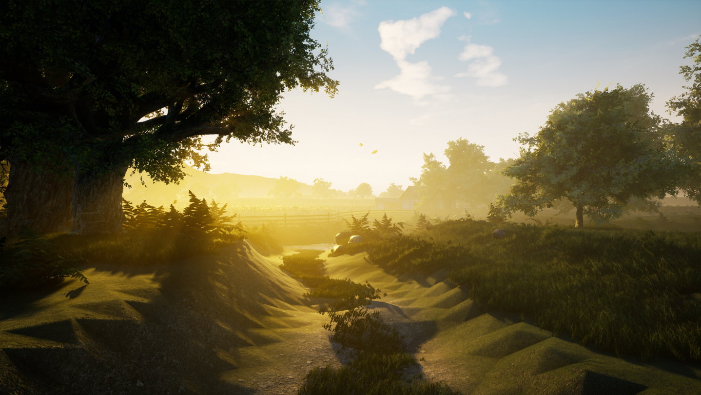 Crossing the creek, you see a long straight dirt road edged by a neat wooden fence while the eye can see. On the other side of the fence, in the shade of ancient oaks, lies a lovely farmhouse. The wind carries a mouth-watering scent to you from the direction of the building. Behind the house lies a vegetable garden and a pig farm, and beyond that is a large barn, a windmill and a semi-finished building.