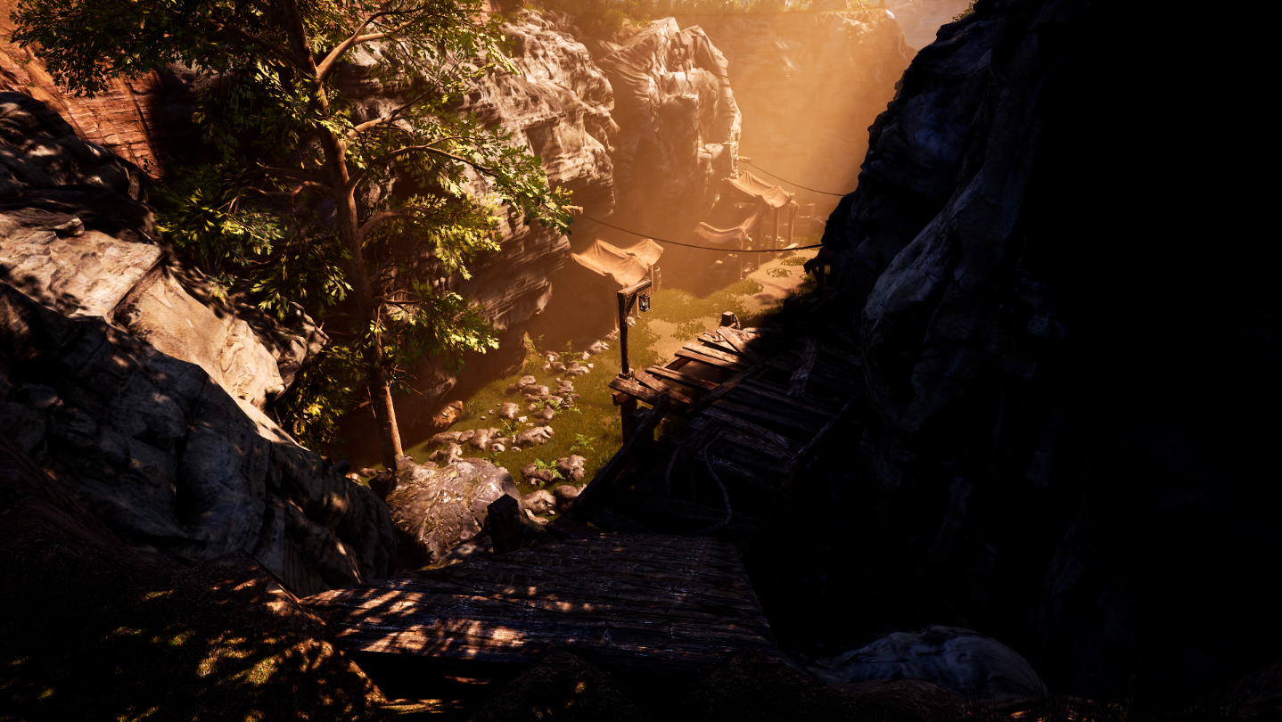 This scene was inspired by a personal experience I had while hiking, when we came across a huge fissure next to a route. We climbed down and saw a similar sight to what you can see in this scene (except the buildings and the equipment of course). It immediately occured to me what a good little hiding place could be created here.