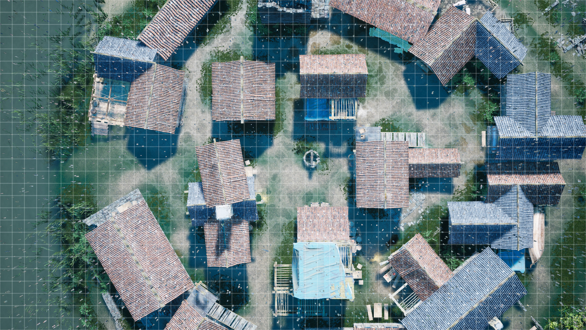 The settlement is located on a small island in the middle of a river, within the walls of an ancient structure. On each side of the island, a bridge leads to the shore, connecting the two sides of the river. There are not many of the ruins left, a few walls, and a stone tower at one of the bridgeheads. In front of the bridge, a wandering merchant struck a homestead with a varied portico. On the outskirts of the village, there is a tavern with a unique garden area.