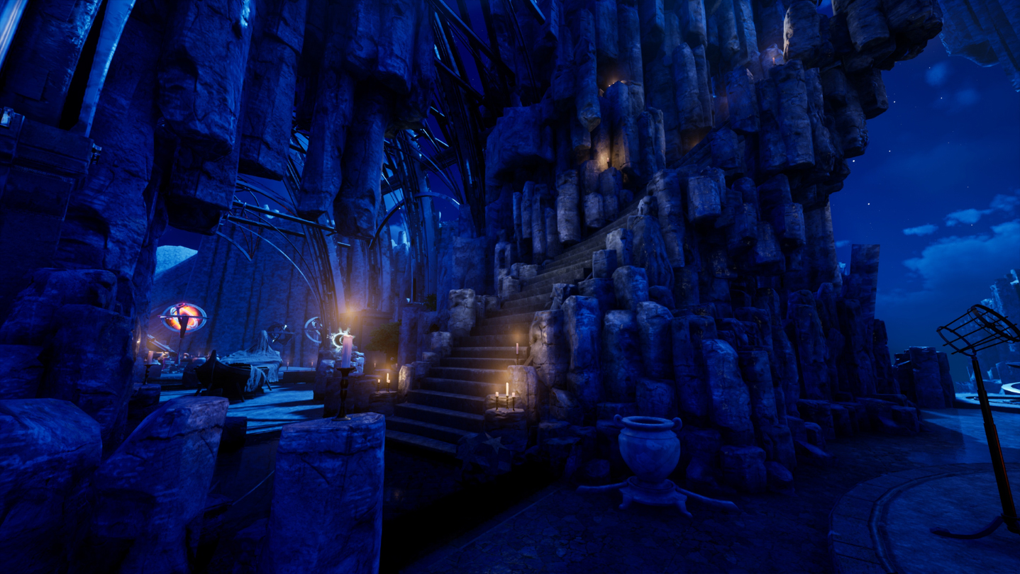 A seemingly floating stone staircase leads down to a room surrounded by basalt blocks, with circle of magical runes at its center. To the left is a messy library which seems to have experienced an earthquake, with most of the books lying on the floor, and the tables lined up in a strange mess. In the other direction there is an observatory. In the middle, a scaled-down magical replica of the solar system floats and rotates, at the end, a colossal telescope spies the sky; who knows looking for what.
