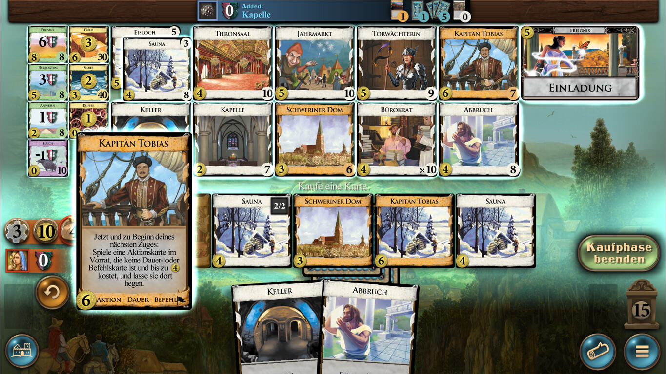 Dieses Paket enthält 5 neue Karten: Kapitän Tobias, Schweriner Dom, Abbruch, Sauna, Eisloch, und ein neues Ereignis: Einladung. Sauna und Eisloch sind ein gemischter Stapel.
