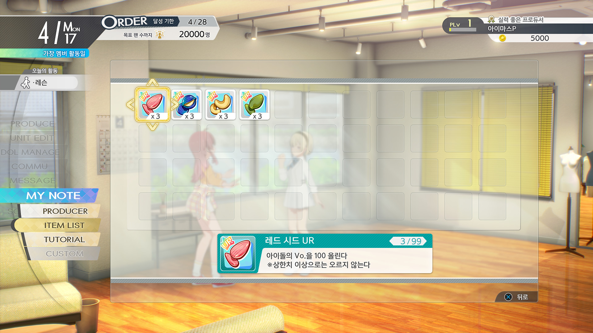 아이돌의 Vo.을 100 올립니다. (상한치 이상으로는 오르지 않음)
