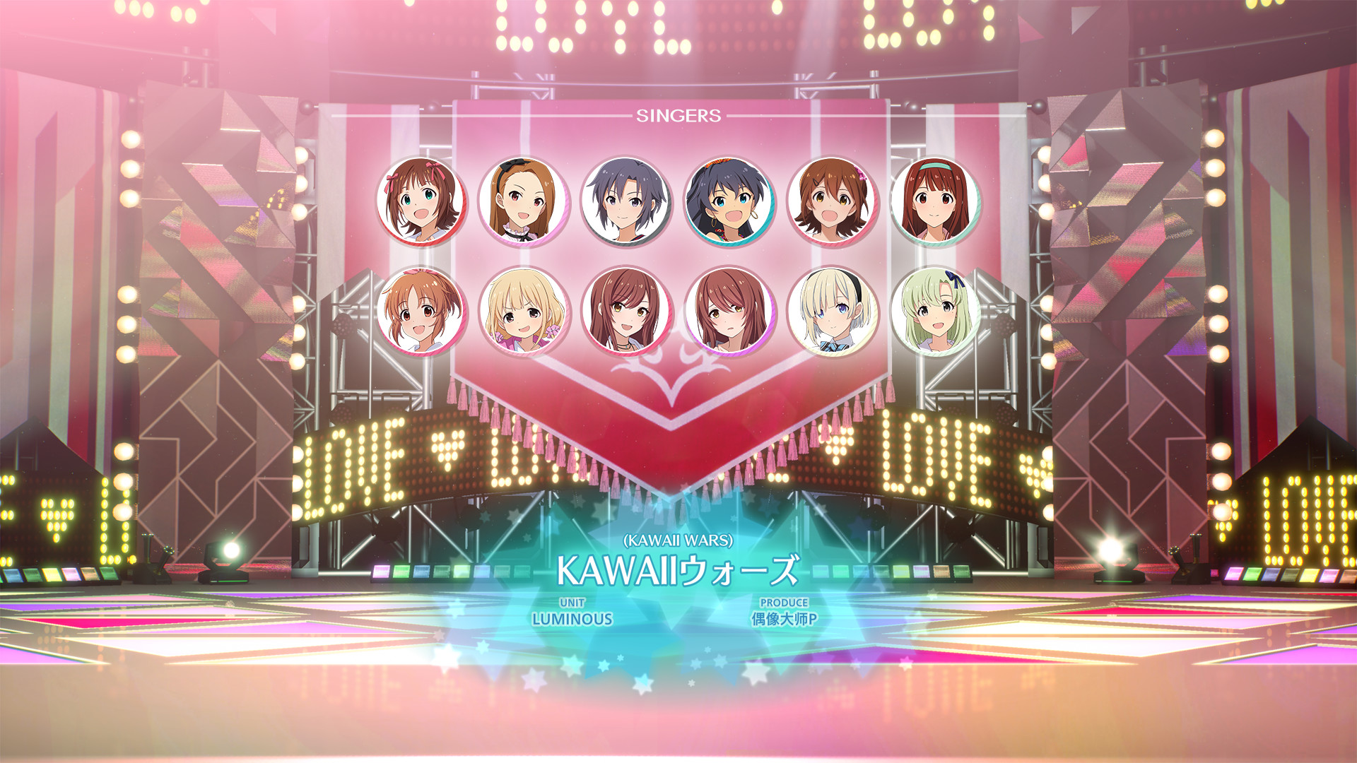 演唱偶像:【春香】 【伊织】 【真】 【响】 【未来】 【琴叶】 【菜菜】 【杏】 【甘奈】 【甜花】 【心白】 【诗花】