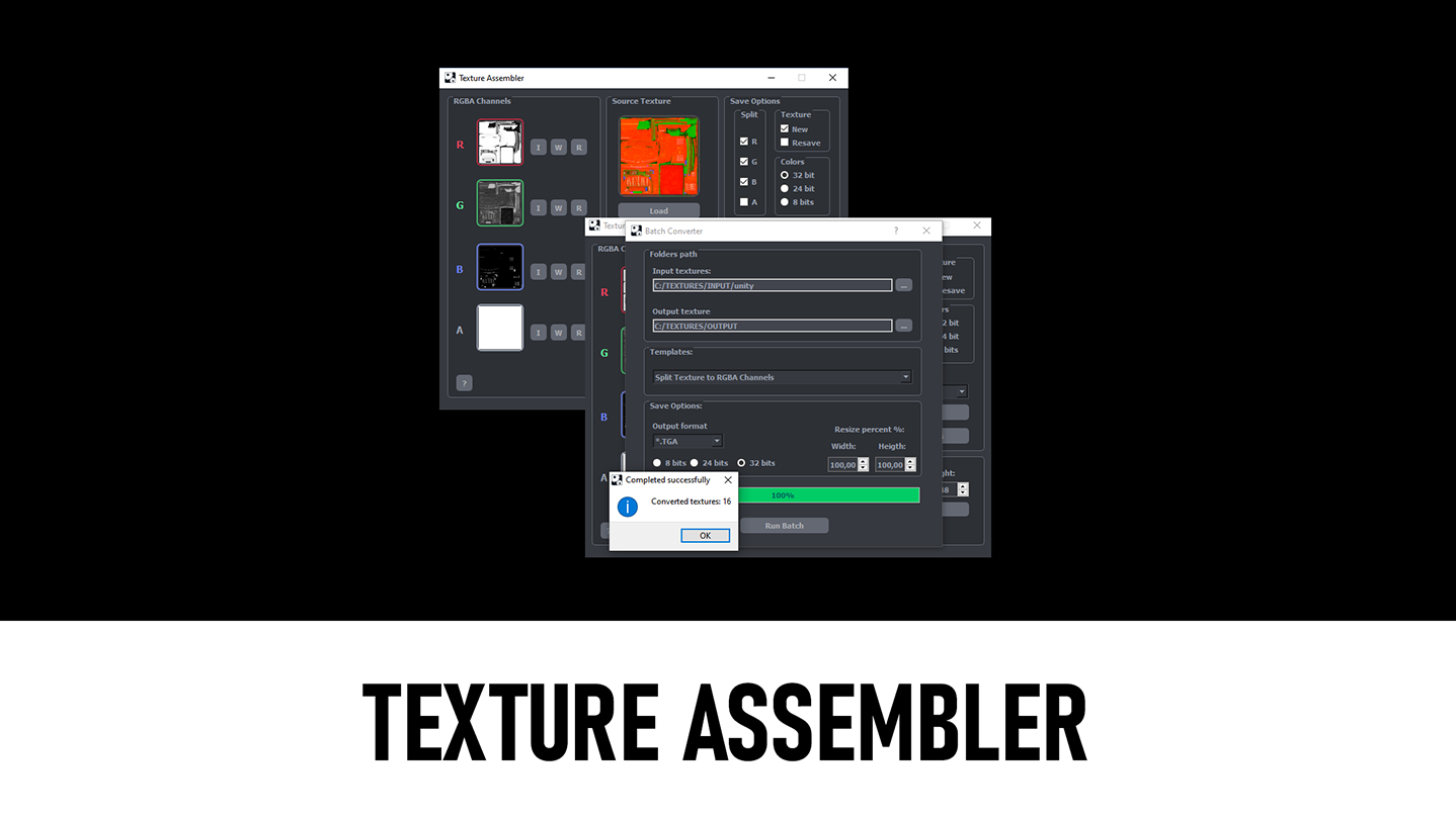 Texture Assembler - is a tool for quick and easy manipulation of RGBA image channels. For example, it can be used to convert textures between different engines. It can: