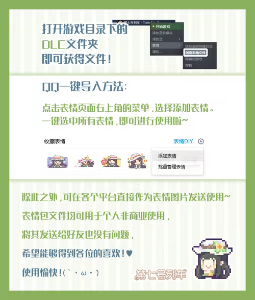 时至游戏上线一个月之际,我们委托了工作室的成员“一粒像素_”绘制了游戏主角即列车少女的像素表情包作为游戏的付费DLC发布,有意向支持本游戏的可以购买该DLC,表情包文件均可用于个人非商业使用,将其发送给好友也没有问题,希望能够得到各位的喜欢!