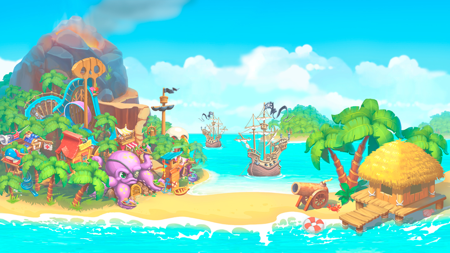 Enjoy the great Match 3 Pirate Adventure. Form groups of three or more crabs, canons, steering wheels, explosives and other pirate items to unlock powerful boosters and complete all level goals. Use the right strategy, earn coins and build your own great theme park on Pirate Island.