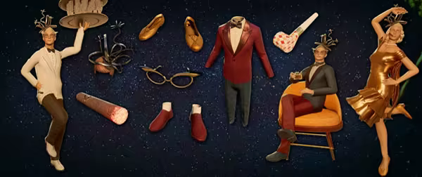 Ring in the new year with this refreshing customization pack! You'll receive 20 items to celebrate! Accessorize with different Party Hats, a noise maker, a cigar and NYE glasses while you wear the Quirky Dress Suit or Quirky Cocktail Dress! For days of auld lang syne.