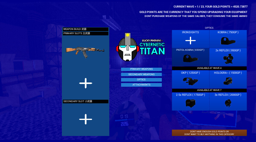 Cybernetic Titan is a First-Person Survival Shooter set in Gemstone Island's Capital: Advanced City, It has multiple different survival maps to choose from where you fight 23 waves of enemies in a map with weapons of your choice,, Survival takes 1-2 hours on average to beat all 23 waves of enemies on a chosen map. You start on wave 1 must kill all GTC enemies arriving on your location to kill you to reach the next wave beating waves unlocks new weapons and equipment which you can equip, when you reach wave 23 you and Corporal McGregor will escape the location to safety and then you can choose another location to survive in. Firearms in are fully customizable with multiple modern day sights and scope attachments Examples: Red Dot sight, Holographic sight, Kobra Sight, Pistol Reflex Sight, Extended Mag & Drum mag.